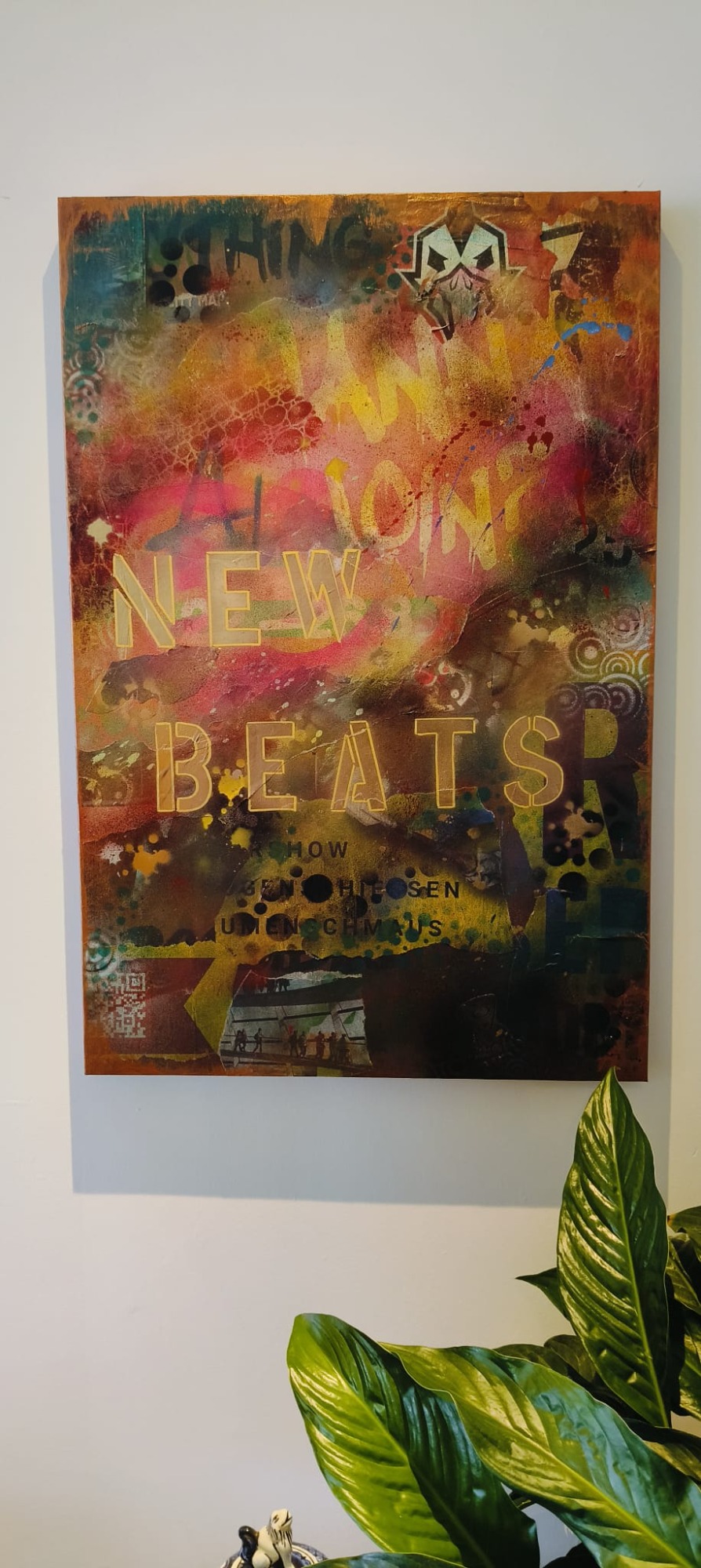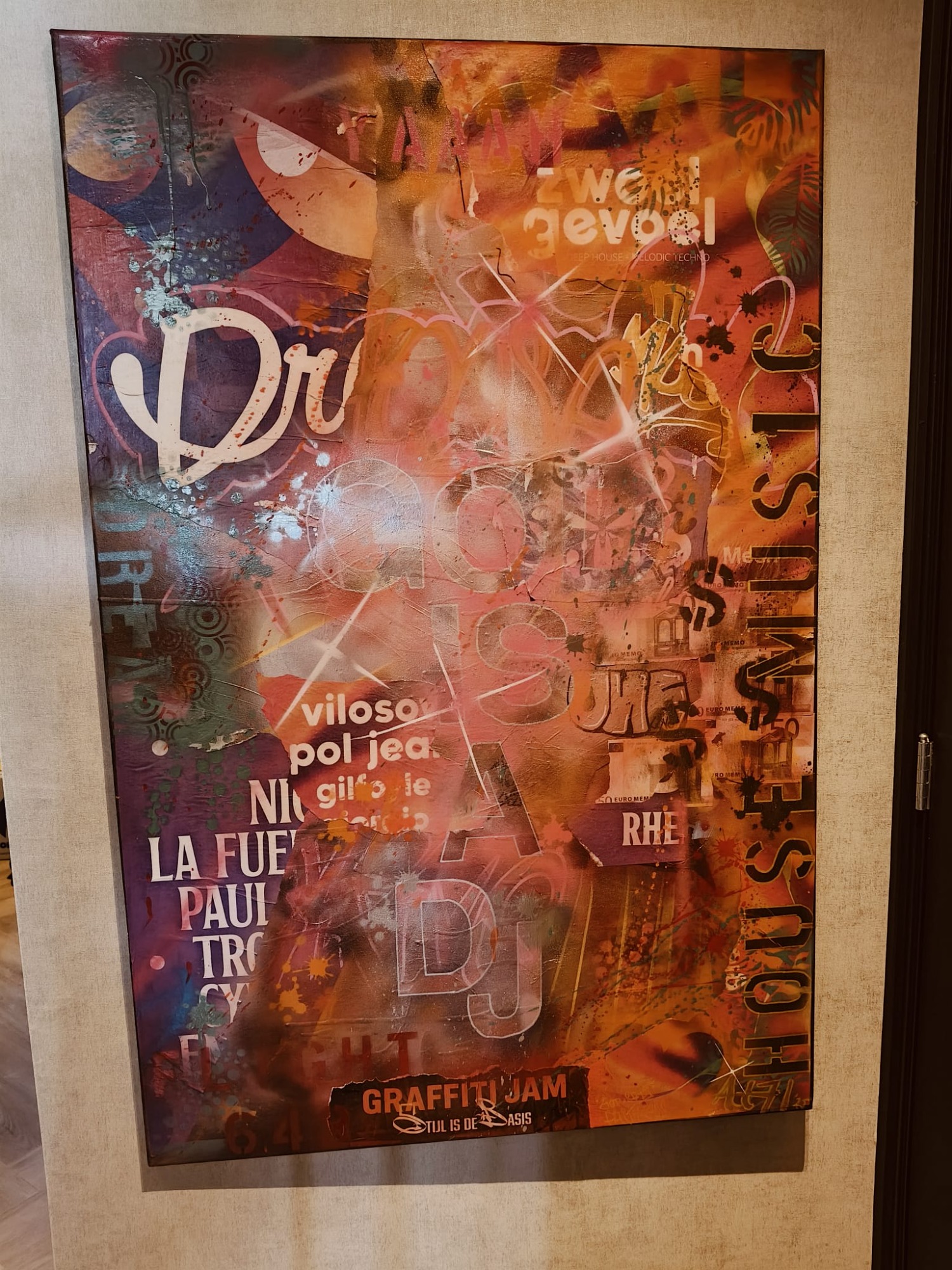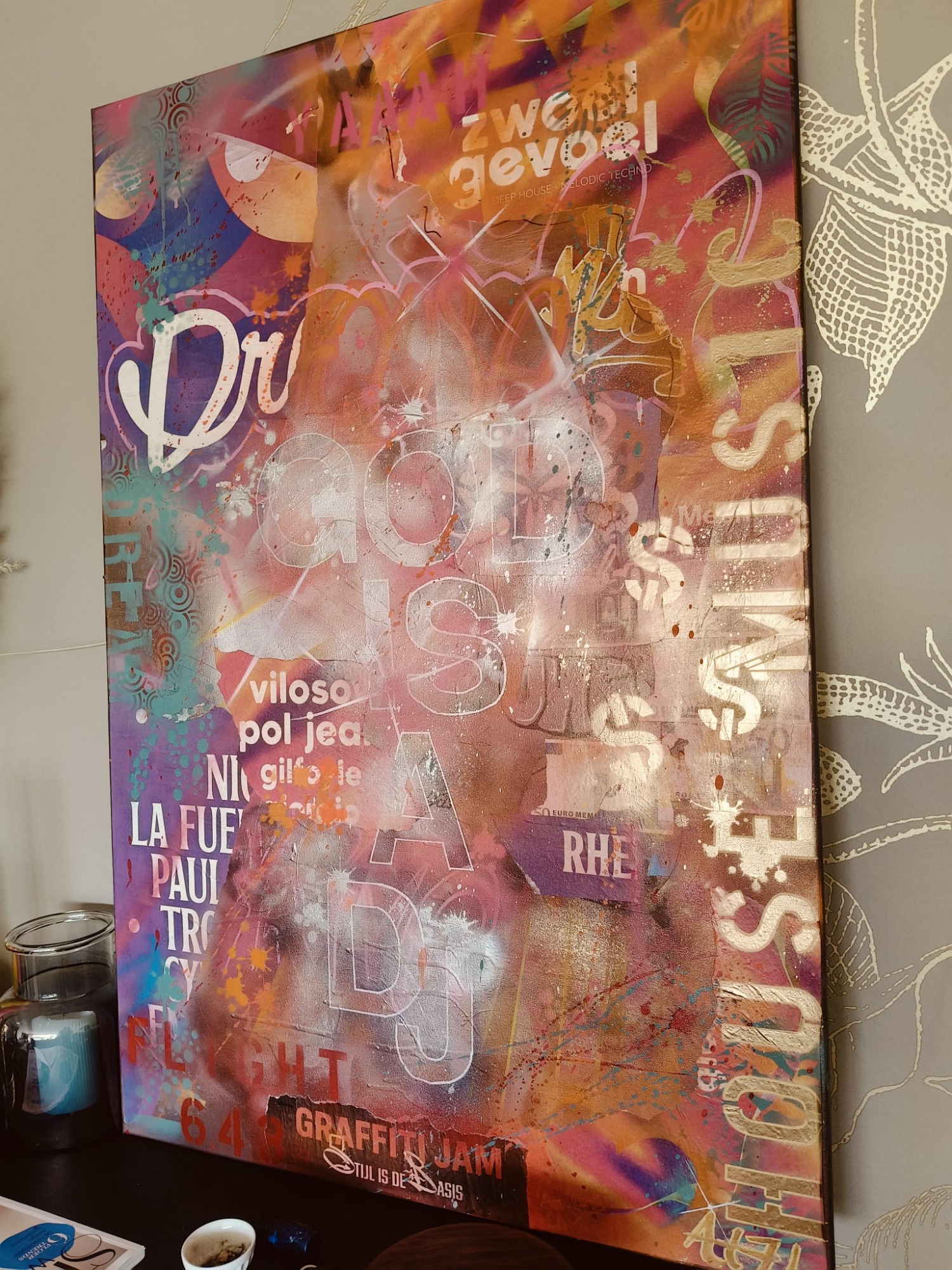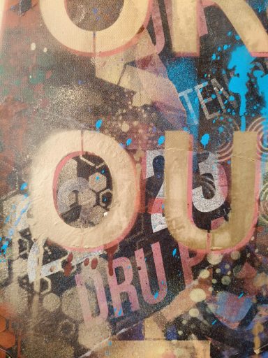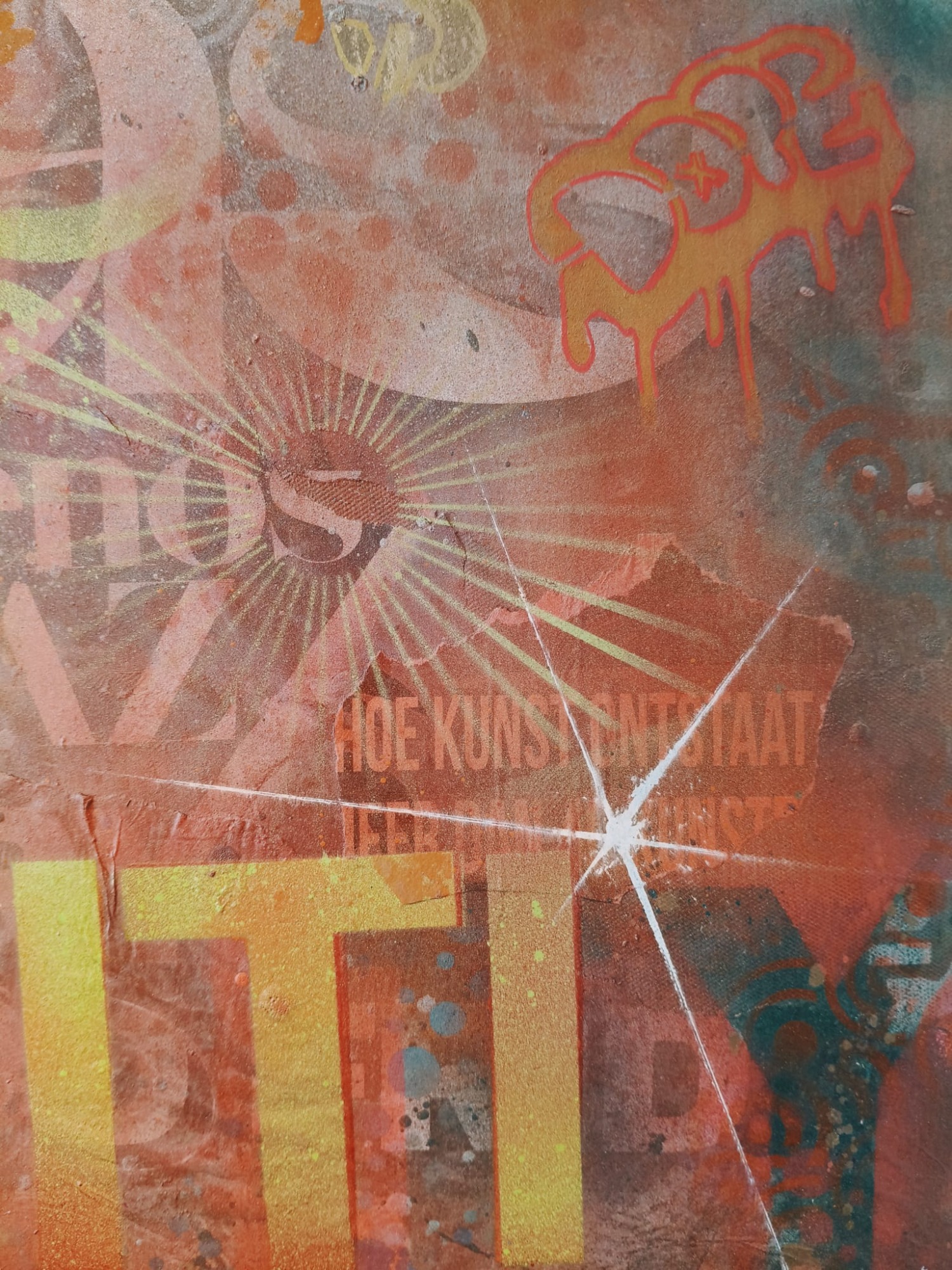 Spraypaint en verschillende straat prints op canvas