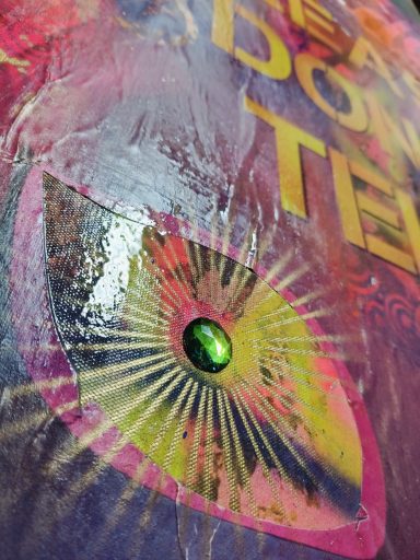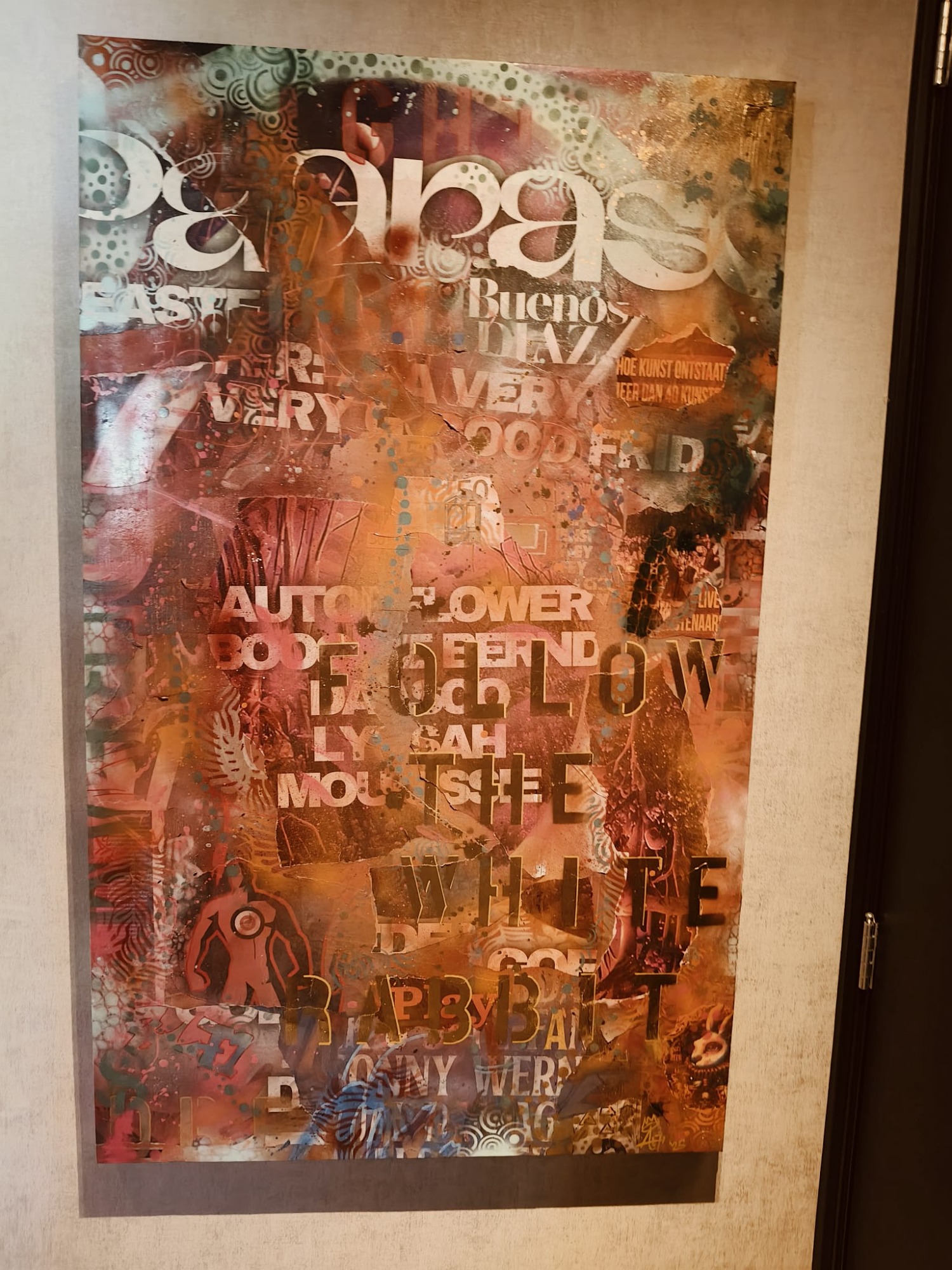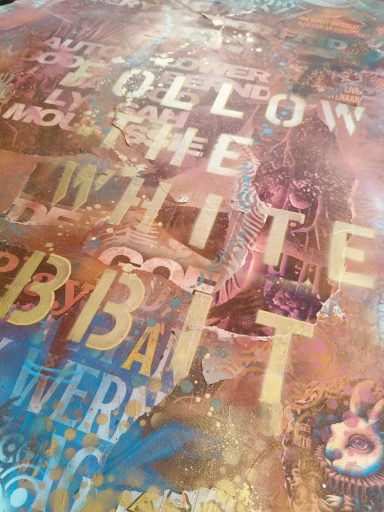 Mixed Urban media van spraypaint, straatposters en bonte letters. Op zoek naar de waarheid in de matrix van festivals en muziek. Op zoek naar de "White Rabbit" (The Matrix) in een avontuur van kleur.