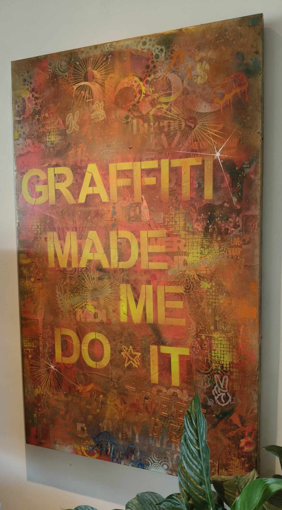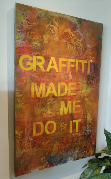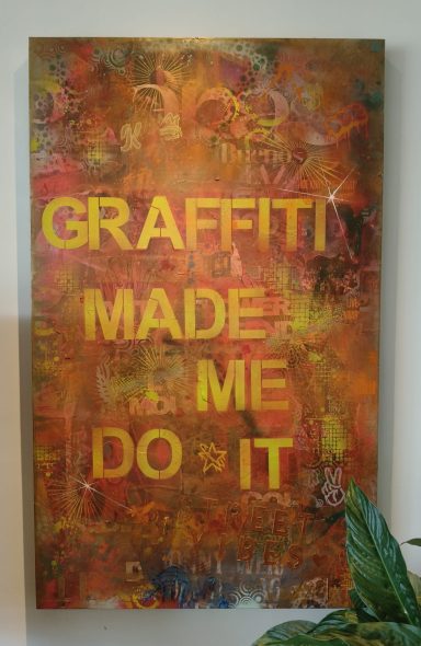 Straatposters, spuitbus, acryl stiften met een mix van verf en sjablonen ontstaan uit een passie voor Graffiti dat terug gaat tot de oorsprong uit de jaren '80 en '90. "Graffiti Made Me Do It" vertelt het verhaal van de oorsprong en de toekomst !
