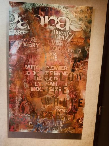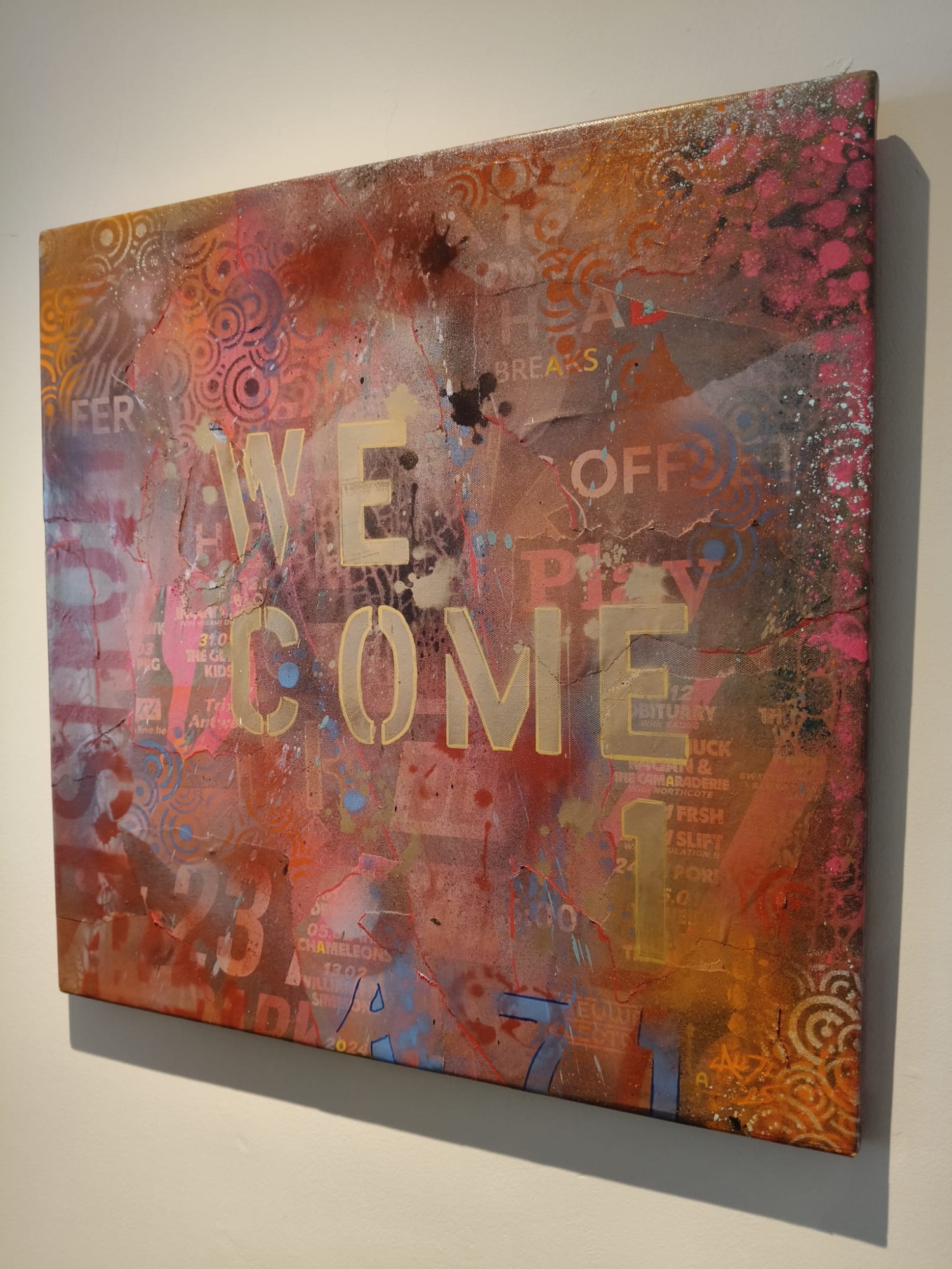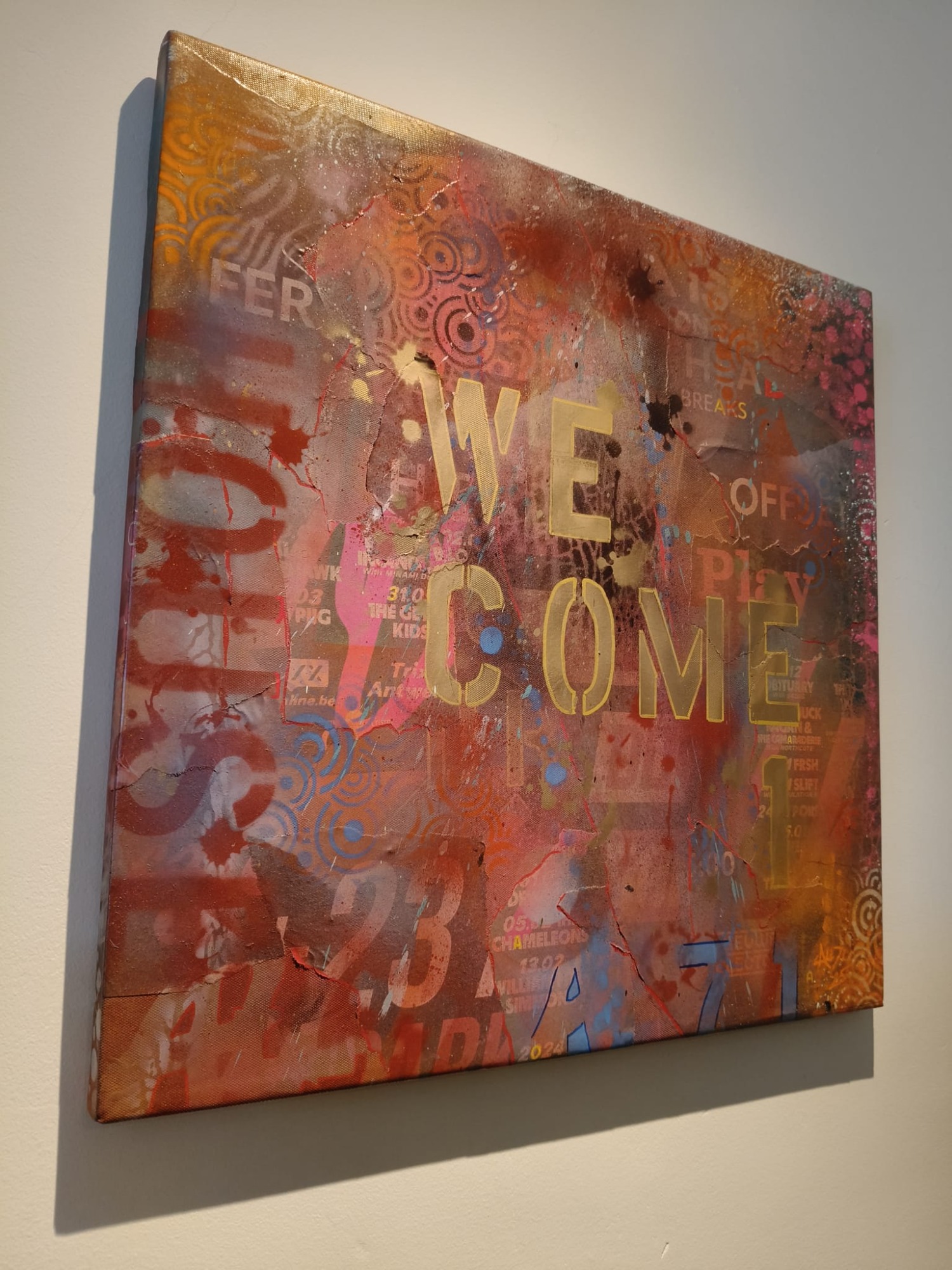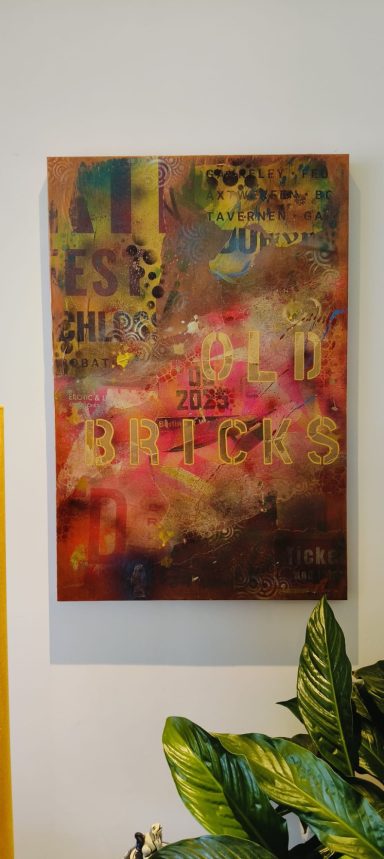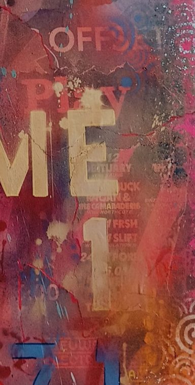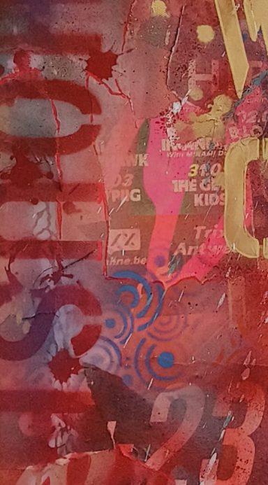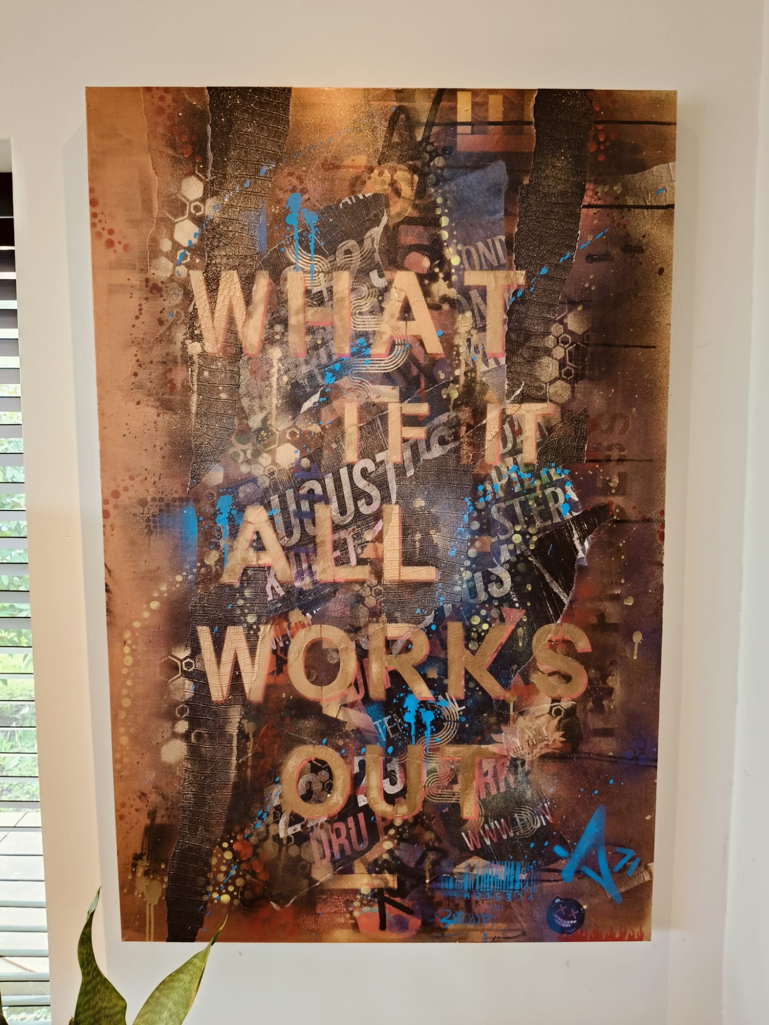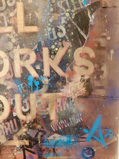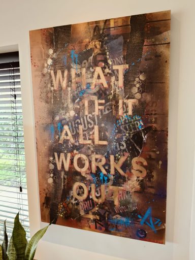 Mixed media met Graffiti elementen en abstracte patronen "What if it all works out". Urban energy en een optimistische boodschap, want stel je voor... Ga ervoor en doe het, wat heb je te verliezen. Het zou maar zo kunnen werken. Spuitbus, straatposters, behang en sjablonen maakt dit werk tot wat het is